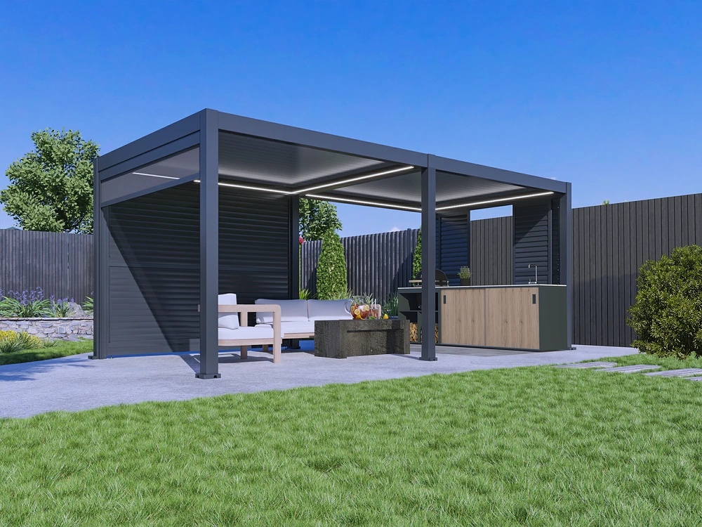 Pergole so na voljo v standardnih dimenzijah ali popolnoma prilagojene po meri – z možnostjo dodajanja ZIP-screen senčil, fiksnih ali drsnih lamelnih sten ter pametnih senzorjev za dež, veter in svetlobo.