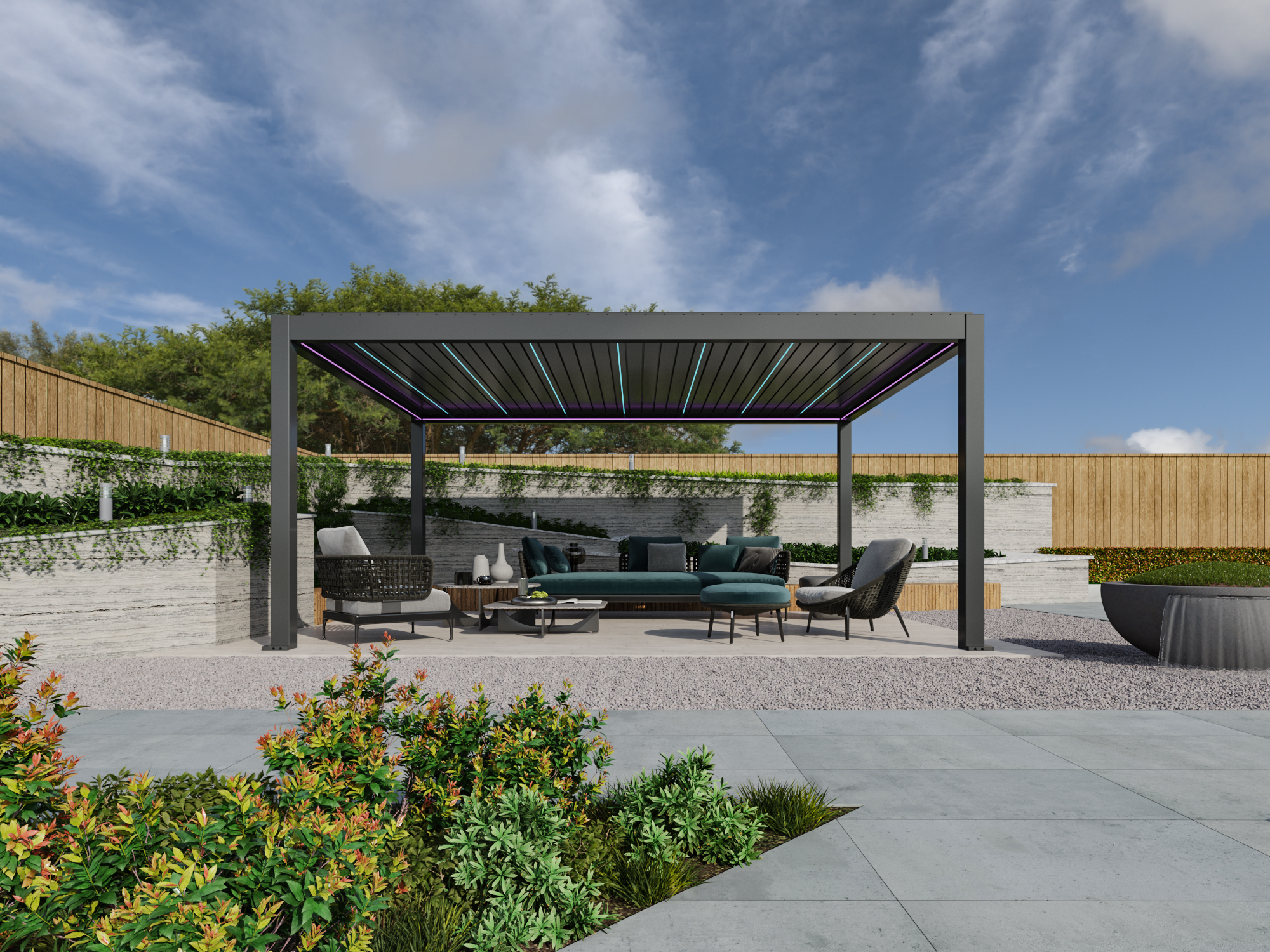 Umfangreiches Zubehör ist erhältlich: ZIP-Sonnenschutz, LED-Beleuchtung, Schiebe- und Festwände sowie integrierte Wind-, Regen- und Lichtsensoren.